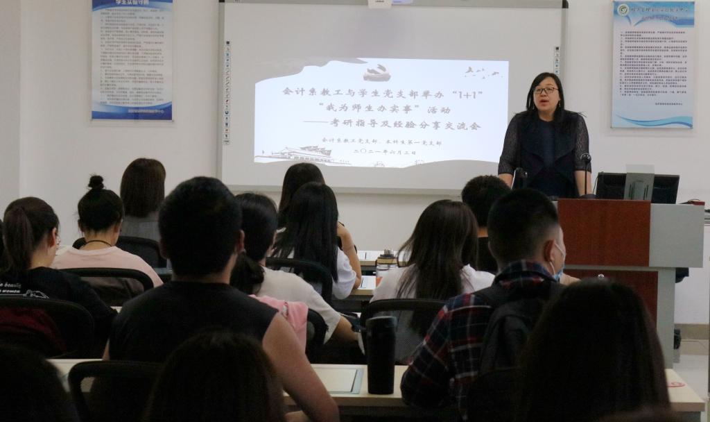 为助力研究生备考,增进我院考生对研究生各项政策的了解,提高考研质量,我院会计系教工与学生党支部于6月3日下午在学院328教室举办“1+1” “我为师生办实事”活动——考研指导及经验分享交流会。此次会议由我院会计系教工党支部书记范文娟主持,研究生代表樊家耀、付陈晨、雷佳丽、乌日格木乐四位同学及会计系研究生备考学生参与会议。