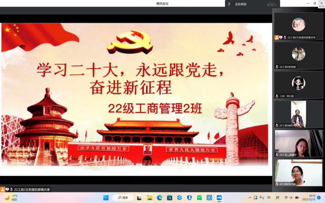 为深入学习贯彻党的二十大精神,强化广大团员青年的政治品格,引导我院学子感党恩、听党话、跟党走,12月13日,我院各团支部于线上开展“学习二十大,永远跟党走,奋进新征程”线上主题团日活动。本次活动由团支书主持,全体同学积极参加。