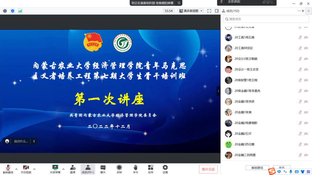 为深入学习宣传贯彻党的二十大精神,加强我院青年学子思想建设,推动我院学生工作迈上新台阶,近日,我院于线上开展“青年马克思主义者培养工程”第七期大学生骨干培训班第一次讲座,马克思主义学院教授扎布老师主讲,青马班全体学员积极参加。