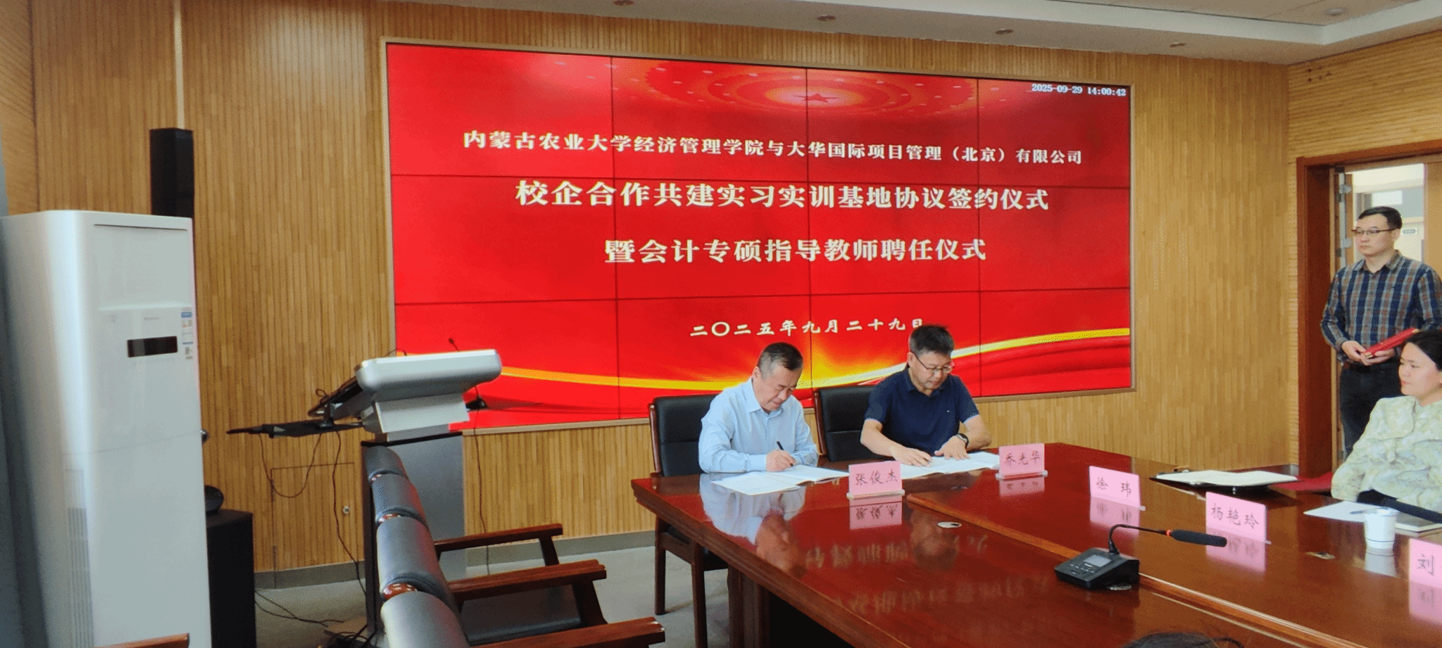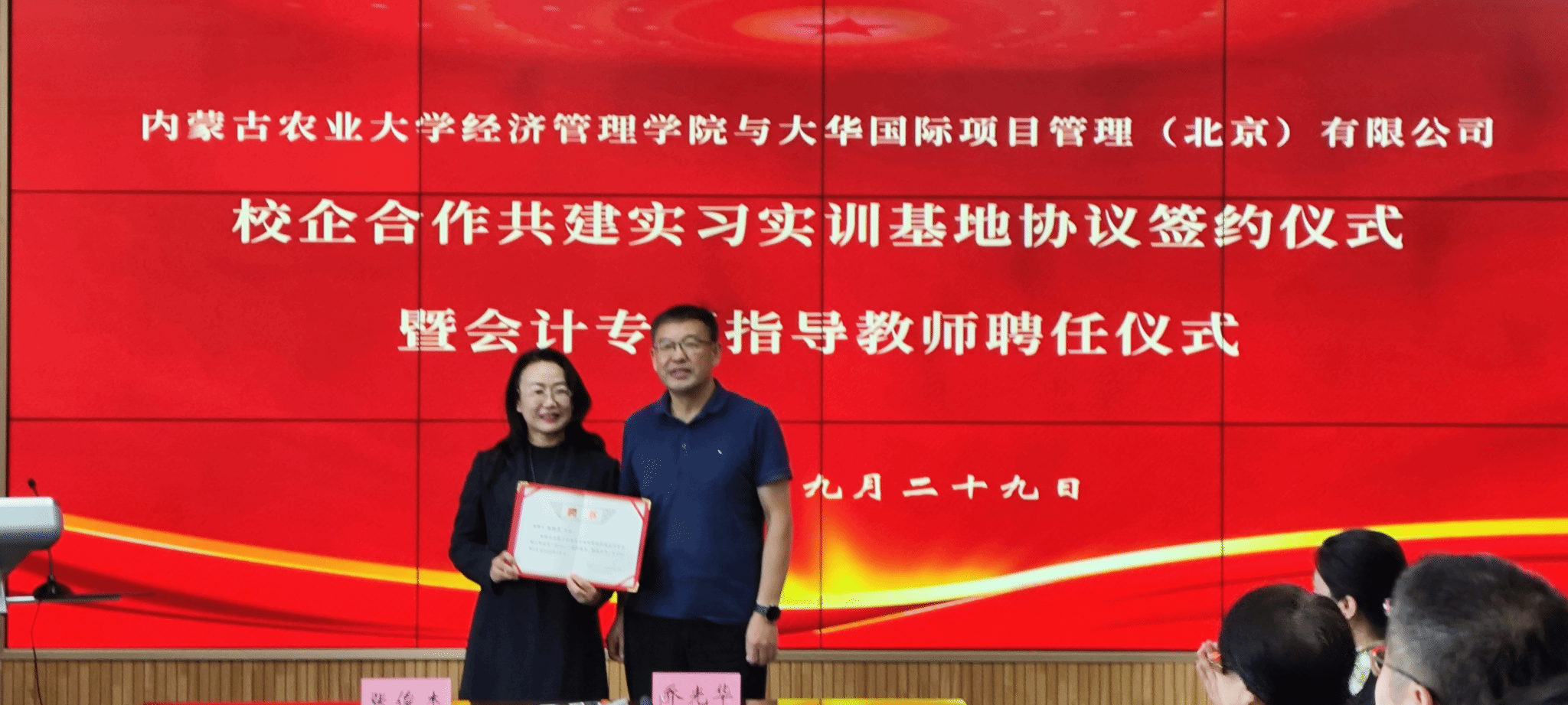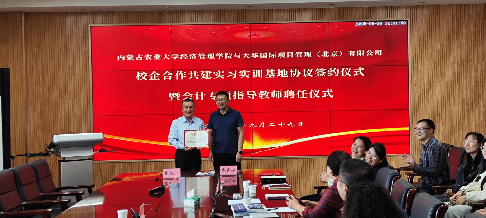 2025年9月29日,学院与大华国际项目管理(北京)有限公司在519会议室,隆重举行校企合作共建实习实训基地协议签约仪式暨会计专硕(MPAcc)指导教师聘任仪式,副院长张建成主持会议,大华内蒙古会计分所执行合伙人赵艳灵、行政总监尹亚冰,张心灵教授、各位系主任及学院师生共同见证此次校企合作重要时刻。